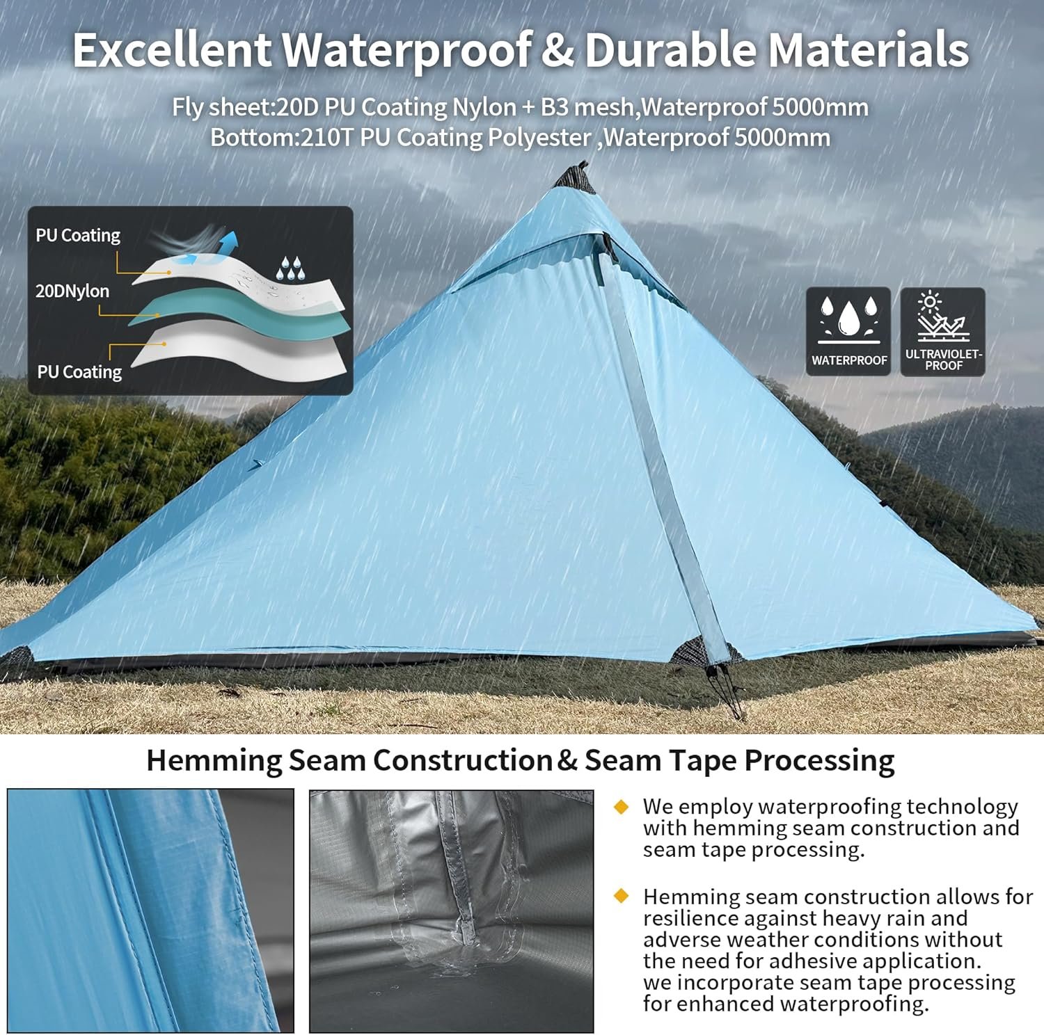 - 【Material and Performance】: The flysheet is made of 20D nylon with B3 mesh, the bottom is made of 210T PU-coated polyester, both providing 5000mm waterproofing.The tent is lightweight yet strong, standing solid as a rock in windstorms, hail, and thunderstorms. It is also UV-resistant and tear-resistant.